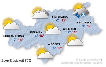 Die Höchstwerte reichen von 11° in Sterzing bis 17° in Bozen.